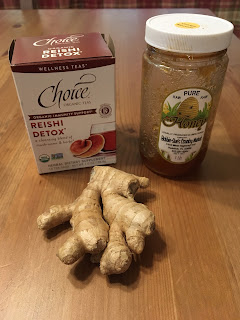 9. Husband-approved tea: Reishi detox mushroom blend, one bag for a medium kettle, add a tablespoon of organic local honey (read about the horrors of imported honey here if you care) and shred one of the organic ginger-fingers (skin on) over the kettle and let steep from boiling for ten minutes before drinking. I can feel my lymph nodes clearing after this one.